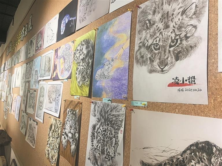 獲救時(shí)蜷縮的身影、被工作人員抱起時(shí)的乖巧模樣、恢復(fù)活力時(shí)騰躍的瞬間,在西寧野生動(dòng)物園2323高原生靈實(shí)驗(yàn)室二樓的展示墻上,120余幅以“凌小蟄”為主人公的繪畫作品被陳列展出。