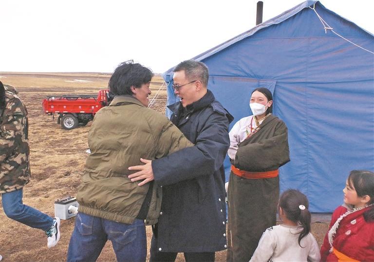 王啟洋(中)與牧民群眾相擁。受訪者本人供圖