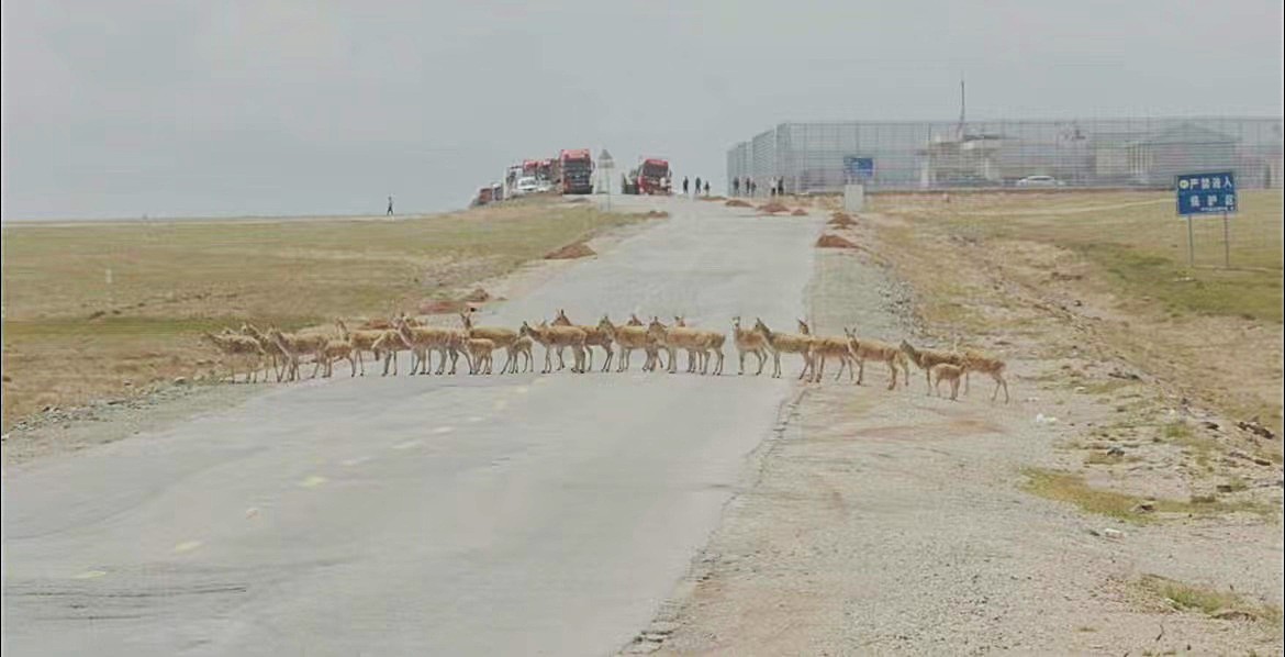 五道梁第一批回遷的藏羚羊穿過(guò)青藏公路??煽晌骼锕芾硖幑﹫D