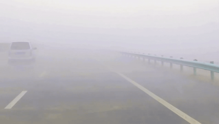 汽車像得了瘧疾,隨著狂風(fēng)一陣陣打擺子。整個(gè)公路都被黃色吞沒,只剩下模模糊糊的白色車道線。司機(jī)躬著身子,像趴在方向盤上一樣,瞪著眼睛盯著前方,頭快要抵到前風(fēng)擋玻璃了。