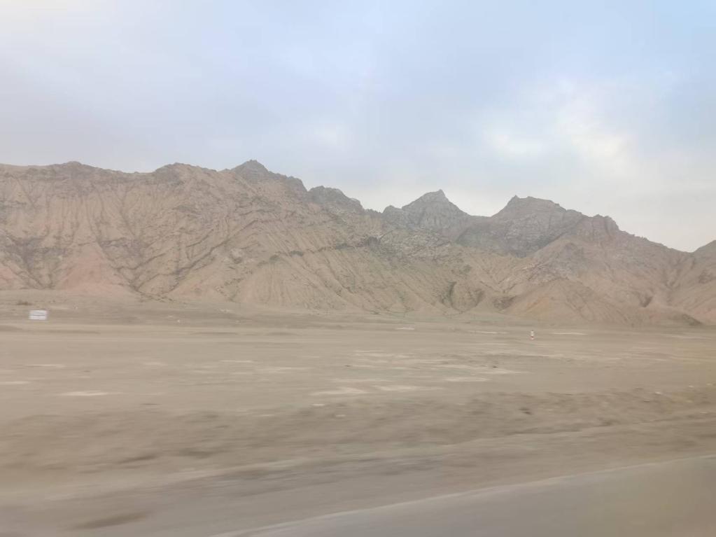 半個(gè)小時(shí)之后,風(fēng)勢在幾滴雨點(diǎn)的打擊下,漸漸緩和下來。當(dāng)沙幕隱去,露出被磨洗過的藍(lán)天時(shí),我們都長舒了一口氣。擋風(fēng)玻璃上的兩側(cè),裹了厚厚一層泥巴。遠(yuǎn)處的山峰頂上,白雪在太陽的余暉下,染成了金黃。