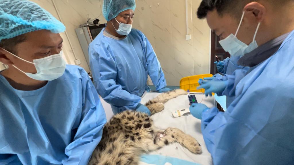 青海野生動(dòng)物救護(hù)繁育中心工作人員在救治雪豹幼崽“凌小芒”。新華社發(fā)