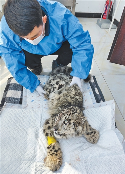 3月5日下午,雪豹抵達(dá)西寧野生動(dòng)物園獸醫(yī)院。經(jīng)初步診斷,雪豹體重不到20斤,有低溫、脫水、骨折、腹瀉、肝功能異常等問題。獸醫(yī)楊文斌回憶:“它從高空墜跌下來,頸、胸椎和后肢軟組織都有損傷?!苯?jīng)過抽血化驗(yàn)、處理傷口,雪豹被送入恒溫氧艙,工作人員輪流值班觀察,持續(xù)給它輸液……