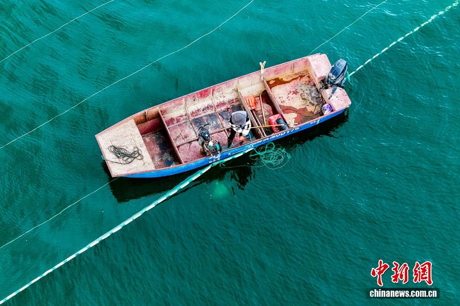 圖為漁民查看布置完成的漁網(wǎng)。(無人機(jī)照片)中新社記者 薛蒂 攝