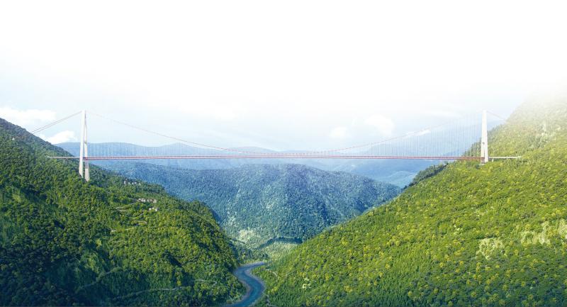 既要考慮高速公路的線性布局,又要對(duì)接支線互通,瀘沽湖特大橋的選址極為苛刻。大橋橫跨臥羅河,橋面到水面落差高達(dá)500米,受地形限制,大橋被“逼”出三項(xiàng)世界之最:世界最大跨徑空間纜懸索橋、山區(qū)世界最大跨徑鋼桁梁懸索橋、世界最大U型隧道錨。