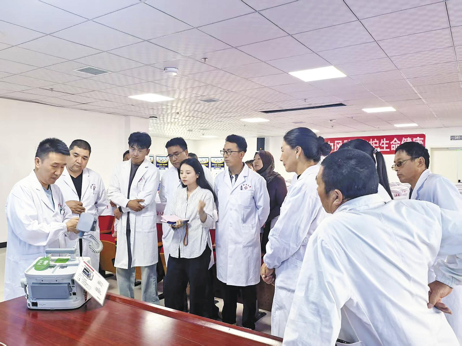 高超醫(yī)生在為基層衛(wèi)生院醫(yī)護(hù)人員講解除顫器的使用。