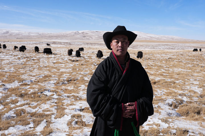 1月31日,青海省玉樹藏族自治州曲麻萊縣麻多鄉(xiāng)郭洋村牧民各求在草原上放牧。新華社記者 張龍 攝
