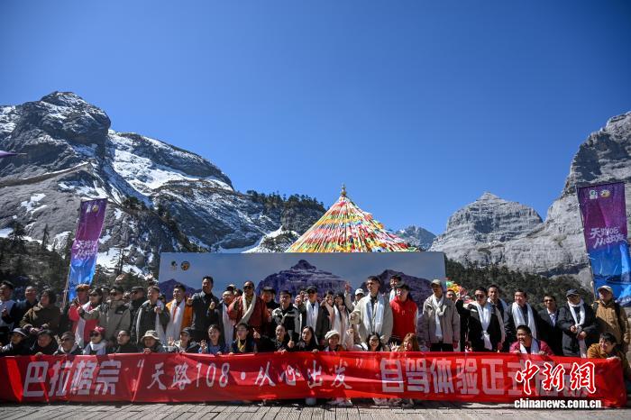 3月11日,巴拉格宗景區(qū)創(chuàng)始人斯那定珠(左一)為首批體驗自駕的游客獻(xiàn)哈達(dá)。中新社記者 李嘉嫻 攝