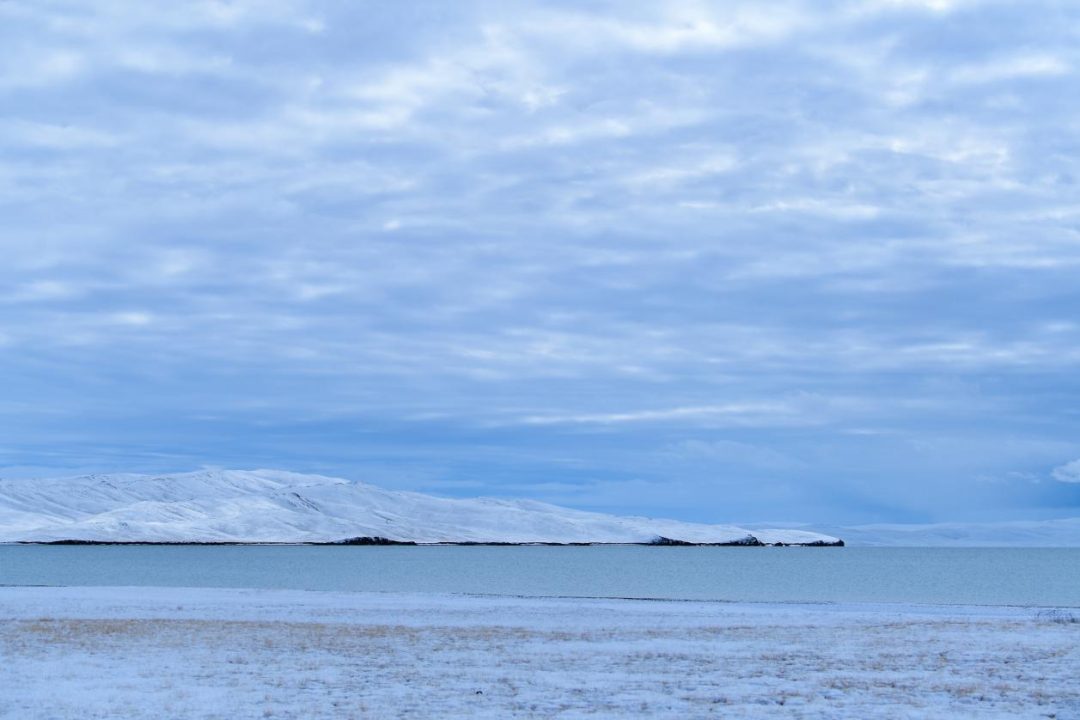 灰蒙蒙的湖泊在積雪的映襯下更加神秘壯觀