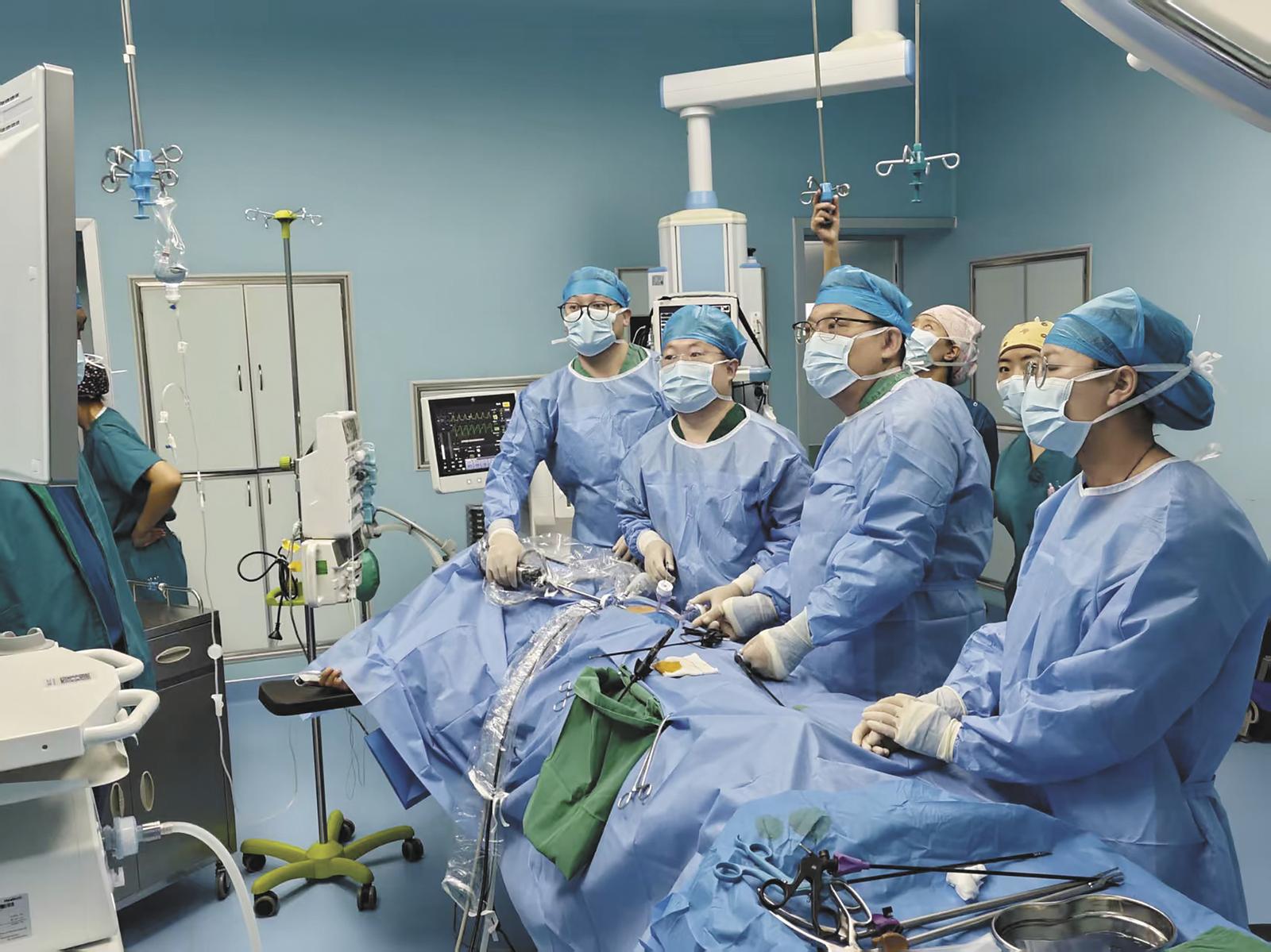 徐維宇(左二)主任在手術(shù)臺旁進(jìn)行鏡下示范,科室團(tuán)隊同步觀摩學(xué)習(xí)。徐維宇供圖