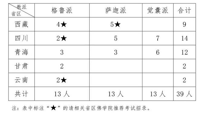根據(jù)國家宗教事務(wù)局《藏傳佛教學銜授予辦法(試行)》,2018年我院計劃招收第十七屆高級學銜班39人,其中格魯派13人,薩迦派13人和覺囊派13人,學制三年。計劃在西藏招收9人,四川招收14人,青海招收12人,甘肅招收2人,云南招收2人。