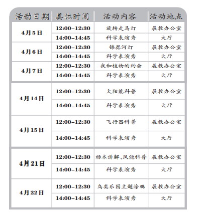 需要提醒大家的是,清明假期(4月5日至4月7日)的活動時間為每天12:00-12:30,14:00-14:45,活動對象為:6-12歲兒童及監(jiān)護(hù)人,一名兒童只允許一名監(jiān)護(hù)人陪同。每場活動限20人參與,活動當(dāng)天提前半小時在大廳東西兩側(cè)報名。