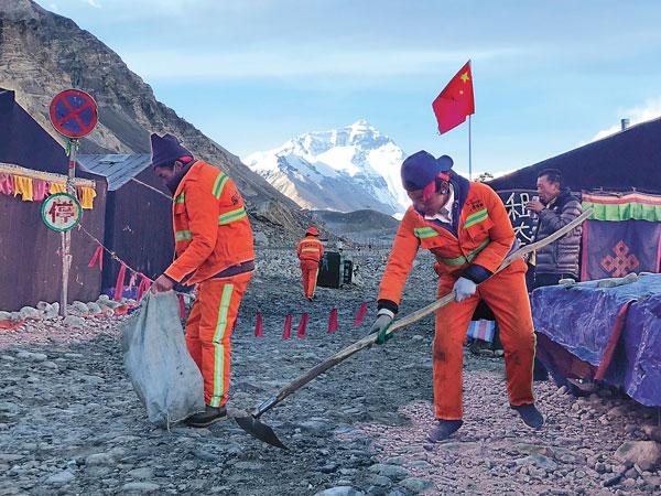 珠穆朗瑪峰巍然聳立在世界屋脊,是我國乃至全世界生態(tài)環(huán)境的“晴雨表”。近年來,黨中央、國務(wù)院高度重視西藏生態(tài)環(huán)境保護(hù),在國家有關(guān)部委大力支持下和自治區(qū)相關(guān)部門共同努力下,珠峰地區(qū)一直實(shí)施嚴(yán)格的環(huán)保措施,形成了多元參與的珠峰生態(tài)環(huán)境保護(hù)格局。在嚴(yán)格的生態(tài)環(huán)保政策作用下,珠穆朗瑪峰我國西藏一側(cè)的生態(tài)環(huán)境持續(xù)向好。圖為近日,海拔5200米的珠峰大本營內(nèi),環(huán)衛(wèi)工人在清理垃圾。記者 陳林 攝