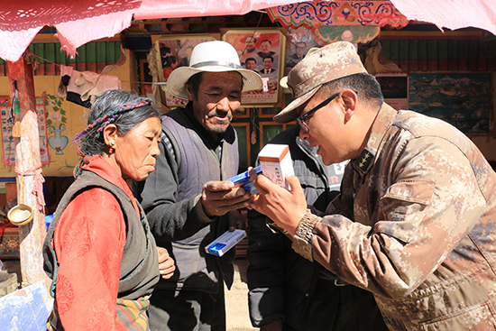 車子剛停穩(wěn),聞訊而來的村民們就排起了長隊。索朗貢布頂著炎炎烈日穿梭在人群中耐心進行翻譯,哪位老人該測量血壓,哪位患者該領(lǐng)取藥品了然于胸,兩個小時過去了都顧不上喝一口水。該部隊衛(wèi)生員應曉晶介紹說,每次義診他們天不亮就起床準備,天黑才匆匆返營,中途餓了就啃幾口干糧,然而只要索朗貢布工作抽得開身,就一定隨隊前往,確保每次義診更加順利圓滿。