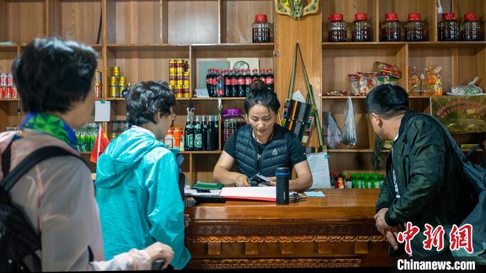 7月17日,雅魯藏布江大峽谷景區(qū)內(nèi),德吉旺姆為客人辦理入住。34歲的德吉旺姆經(jīng)營著擁有73間客房的公尊德姆農(nóng)莊,該農(nóng)莊位于雅魯藏布江左岸,天氣晴朗時(shí),遠(yuǎn)處的南迦巴瓦峰清晰可見。 中新社記者 江飛波 攝