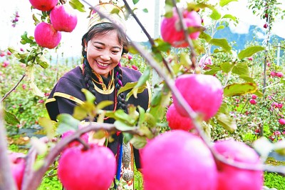 消費(fèi)扶貧讓超億元優(yōu)質(zhì)農(nóng)產(chǎn)品出藏。圖為西藏林芝市米林縣羌納鄉(xiāng)林巴村村民在果園里摘蘋果。新華社發(fā)