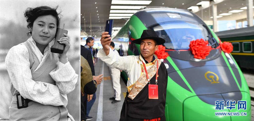 拼版照片:左圖是1994年,腰掛BP機(jī)、手持“大哥大”的藏族女商人拉珍和四川的客戶(hù)洽談生意(新華社記者土登攝);右圖是2021年6月25日,乘客與西藏首條電氣化鐵路拉林鐵路上的復(fù)興號(hào)列車(chē)自拍合影(新華社記者晉美多吉攝)。新華社發(fā)