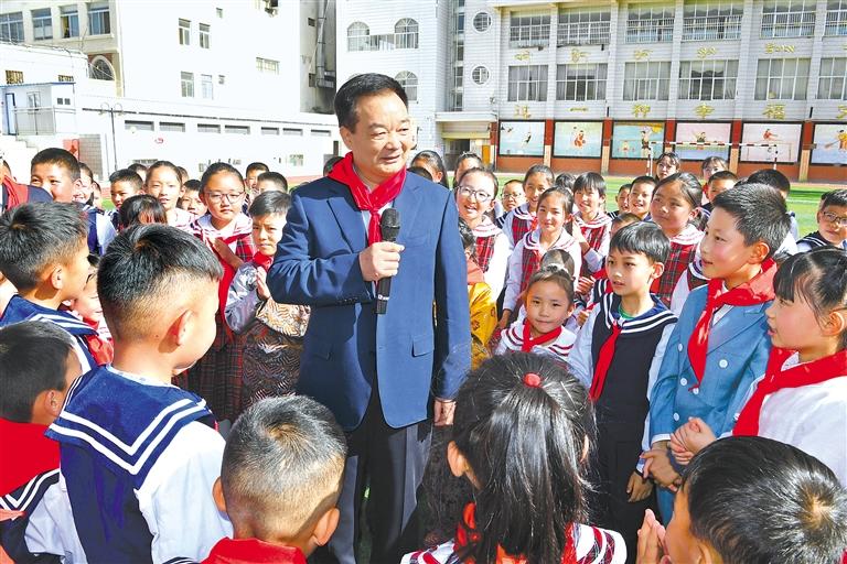 綜合教學(xué)樓二樓活動(dòng)室正在進(jìn)行“紅領(lǐng)巾心向黨”少先隊(duì)紅色尋訪(fǎng)中隊(duì)會(huì),王君正以“大朋友”的身份參加了活動(dòng)。來(lái)自林芝市第二小學(xué)四年級(jí)五班的祥秋卓嘎分享了沿著習(xí)近平爺爺?shù)淖阚E尋訪(fǎng)家鄉(xiāng)巴吉村的故事,如今的巴吉村早已成為名副其實(shí)的“汽車(chē)村”“旅游村”“富裕村”“小康村”。西藏第一批少先隊(duì)員、退休老黨員米瑪次仁講述了西藏第一個(gè)少先隊(duì)組織成立的歷程,當(dāng)沉淀著厚重歷史的西藏第一面少先隊(duì)旗展示在孩子們面前時(shí),他們發(fā)出了驚嘆的聲音,那面旗幟斑駁卻格外鮮艷,時(shí)刻引領(lǐng)著孩子們奮勇?tīng)?zhēng)先。“聽(tīng)了你們講述的故事我很感動(dòng),大家生活在幸福的時(shí)代,希望少年兒童好好學(xué)習(xí)、天天向上!”王君正給孩子們送去《寫(xiě)給青少年的黨史》等書(shū)籍,勉勵(lì)他們牢記黨的恩情、聽(tīng)黨話(huà)、跟黨走,傳承紅色基因,爭(zhēng)做紅色少年,做黨和國(guó)家的好兒女。