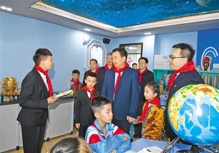 拉薩市第一小學(xué)正在開(kāi)展的“鑄牢中華民族共同體意識(shí)”少先隊(duì)活動(dòng)課豐富多彩。音樂(lè)室里孩子們演奏的六弦琴韻律歡快,王君正駐足傾聽(tīng),夸贊孩子們多才多藝;科技工作室里老師正引導(dǎo)孩子們做科學(xué)實(shí)驗(yàn),王君正認(rèn)真觀看,勉勵(lì)孩子們從小樹(shù)立科學(xué)觀念,講科學(xué)、愛(ài)科學(xué)、學(xué)科學(xué)、用科學(xué),永葆求知探索之心;走進(jìn)美術(shù)室,看到孩子們埋頭練習(xí),王君正關(guān)切地詢(xún)問(wèn):“現(xiàn)在孩子們近視的多嗎?”叮囑說(shuō),要注意保護(hù)孩子們的視力,呵護(hù)好他們的身心健康。