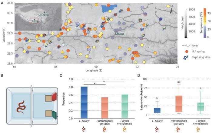 中國科研人員結(jié)合野外調(diào)查和文獻(xiàn)調(diào)研,整理了高原地?zé)豳Y源以及溫泉蛇的分布信息,發(fā)現(xiàn)溫泉蛇高度偏好溫泉生境。通過趨熱行為學(xué)實(shí)驗(yàn)證明,相較于另外兩種低海拔蛇類,溫泉蛇能夠更快速地定位到高溫區(qū)域,且對(duì)高溫區(qū)表現(xiàn)出強(qiáng)烈的偏好,提示溫泉蛇具有高效的溫度感知能力。