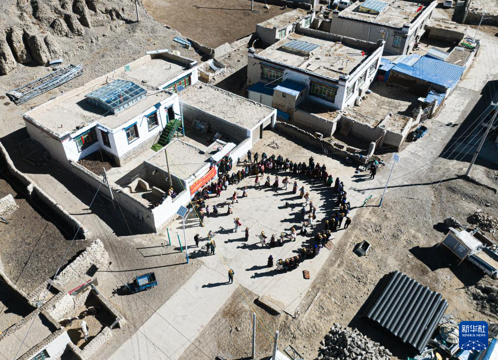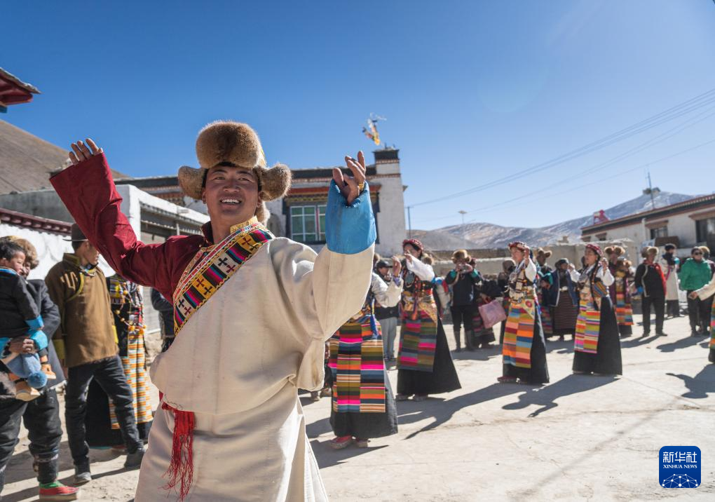 思古龍村的村民們?cè)谔伹f舞(1月13日攝)。新華社發(fā)(丁增尼達(dá) 攝)
