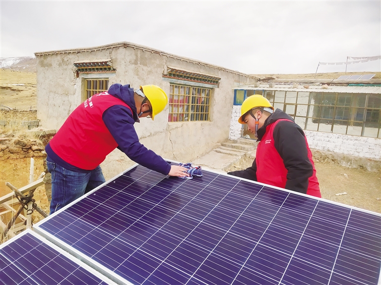 “次桑在家嗎?我們過來看一下你們新年準(zhǔn)備得怎么樣了?”聽到劉光輝的呼喚,孩子們都跑出來迎接這位“小黃帽”叔叔。劉光輝和羅桑歐珠進(jìn)屋放下年貨,顧不上休息,立馬搭梯子爬上次桑家的房頂,用抹布拂去光伏電板上的塵土,拿出工具仔細(xì)檢查電源和光伏設(shè)備是否有損壞。“次桑家用的是我們的第一代太陽能光伏電板,這個電板要經(jīng)常擦拭,保持表面干凈,發(fā)電效率會更好?!眲⒐廨x說。檢修完光伏電板后,劉光輝和羅桑歐珠又回到屋內(nèi)檢查次桑家的電路線路,對插排插座等可能存在安全隱患的地方進(jìn)行認(rèn)真排查。確保沒有問題后,兩人將之前昏暗的燈泡全部換成了最新的節(jié)能燈泡,整個屋子一下亮堂了起來。