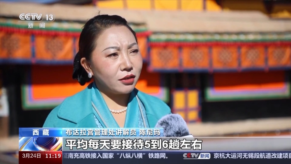 布達(dá)拉宮管理處講解員 陳尼瑪:在高峰期的時候,平均每天要接待5到6趟左右,也就是一天要給50到60人左右進(jìn)行講解。