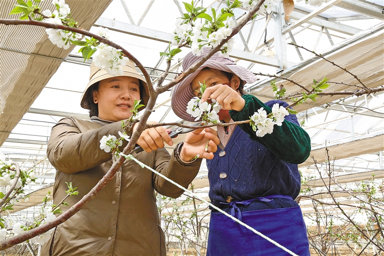 上圖為尼木縣“點(diǎn)對點(diǎn)”干部王榮華(右一)向群眾傳授平谷大桃種植技術(shù)。