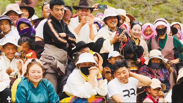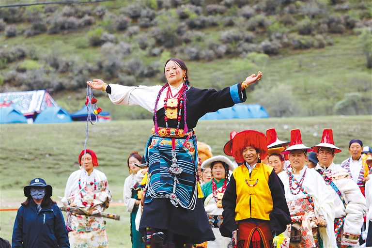 恰拉山以北的林周縣境內(nèi),處處是一片湖光山色交相輝映、風(fēng)吹草低見牛羊的美景,熱振國家森林公園、旁多水庫、生態(tài)長廊阿堆溝等旅游景點集中在北部三鄉(xiāng)?!袄_紛四季·多彩林周”活動在林周縣唐古鄉(xiāng)藏雄村舉辦。從拉薩出發(fā),驅(qū)車170公里,翻越海拔5000多米的恰拉山。一路上,古柏環(huán)繞,云霧繚繞,漫山遍野的杜鵑花競相綻放,宛如進(jìn)入了世外桃源。