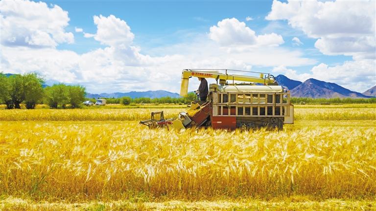 在白朗縣巴扎鄉(xiāng),沿著國道兩邊一幅金黃色的高原“豐收”畫卷徐徐鋪展開來。在巴扎鄉(xiāng)金嘎村,縣農(nóng)牧綜合服務中心的旦增這兩天也把辦公室搬到了田間地頭,指導當?shù)厝罕姷那锸展ぷ??!霸谌镩_展之前,我們組織農(nóng)機合作社的農(nóng)戶進行農(nóng)機具維修保養(yǎng)工作,并對成熟區(qū)域采取了成熟一片收割一片的收割方式,今年全縣糧食播種面積12.74萬畝,預計糧食產(chǎn)量持續(xù)穩(wěn)定在5萬噸以上。”旦增介紹道。