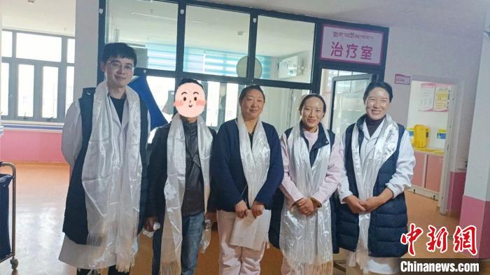 患者家屬向程偉業(yè)(左一)與醫(yī)護(hù)敬獻(xiàn)哈達(dá)。浙江省人民醫(yī)院供圖