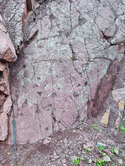 西藏昌都位于青藏高原東部,據(jù)介紹,此研究區(qū)的侏羅紀(jì)地層最大厚度超過(guò)4800米,巨大的沉積厚度促進(jìn)了大量化石的發(fā)現(xiàn),其中就包括恐龍足跡化石。2023年7月,中國(guó)地質(zhì)調(diào)查局自然資源實(shí)物地質(zhì)資料中心項(xiàng)目組于昌都開(kāi)展工作時(shí),在凍多村一段鄉(xiāng)村道路兩側(cè)的石壁上發(fā)現(xiàn)了疑似爬行動(dòng)物腳印,隨即與遺跡學(xué)專(zhuān)家合作組成考察隊(duì)開(kāi)展研究。該足跡化石點(diǎn)頂部為灰?guī)r,由紫紅色砂巖間夾頁(yè)巖、黏土巖組成,含有植物化石、遺跡化石和少許腕足、介形類(lèi)和海百合莖等化石,總體屬于海陸交互環(huán)境??疾礻?duì)在恐龍足跡所在層面與相鄰層面還發(fā)現(xiàn)了如古藻跡、石針跡等遺跡,這些發(fā)現(xiàn)代表這個(gè)地方曾是淺水環(huán)境。因此,研究證明,良好的環(huán)境和豐沛的水資源吸引了恐龍等動(dòng)物在此活動(dòng),并留下豐富的足跡化石。