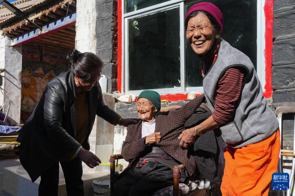 某朗桑姆(中)跟女兒及街坊開(kāi)玩笑(3月20日攝)。新華社記者 晉美多吉 攝