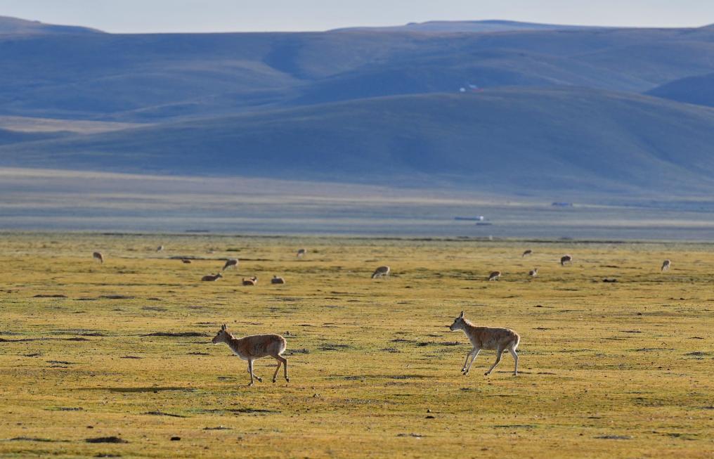 色林錯國家級自然保護(hù)區(qū)那曲市申扎縣片區(qū)里的藏羚羊(2024年8月26日攝)。新華社記者 張汝鋒 攝