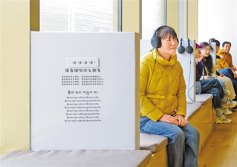 市民游客在西藏博物館內(nèi)戴上耳機欣賞西藏傳統(tǒng)兒歌。