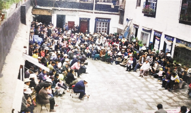 在當(dāng)時(shí)拍的另一張照片上,幾十位居民擠在過道里準(zhǔn)備投票。“那時(shí)候院子小,選舉時(shí)得側(cè)著身子站?!钡录扛禄貞浀?,“院子窄小,雨天積水,但絲毫不影響大家參與社區(qū)事務(wù)的熱情?!闭掌囊唤?,13歲的普布普赤正躲在母親身后好奇張望,如今她41歲,已成長為大院的戶長。