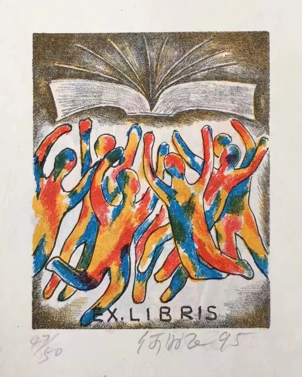 何為民創(chuàng)作的套色石版畫藏書票,該作品曾獲全國第六屆藏書票展銀獎。受訪者供圖