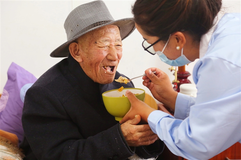 陽(yáng)光穿過明凈的玻璃窗,溫柔地灑在80歲失明老人拉巴次仁手中的木碗上。他捧著熱騰騰的飯菜,幸福的笑容在臉上肆意綻放:“在這里,一日三餐有人端到跟前,臟衣服剛換下就有人洗凈送回,生病也不愁沒人管?!崩先搜哉Z(yǔ)間滿是對(duì)生活的感激。