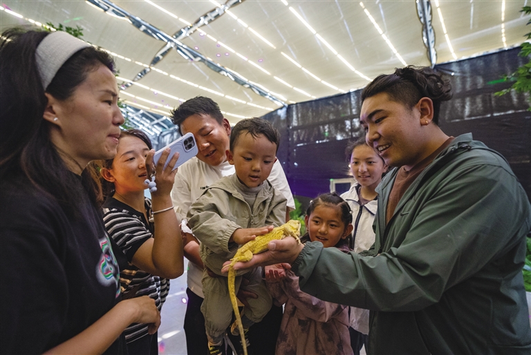 扎囊縣西普休閑觀光農(nóng)業(yè)發(fā)展有限公司建設(shè)的海洋館內(nèi)小孩正在與蜥蜴互動(dòng)。