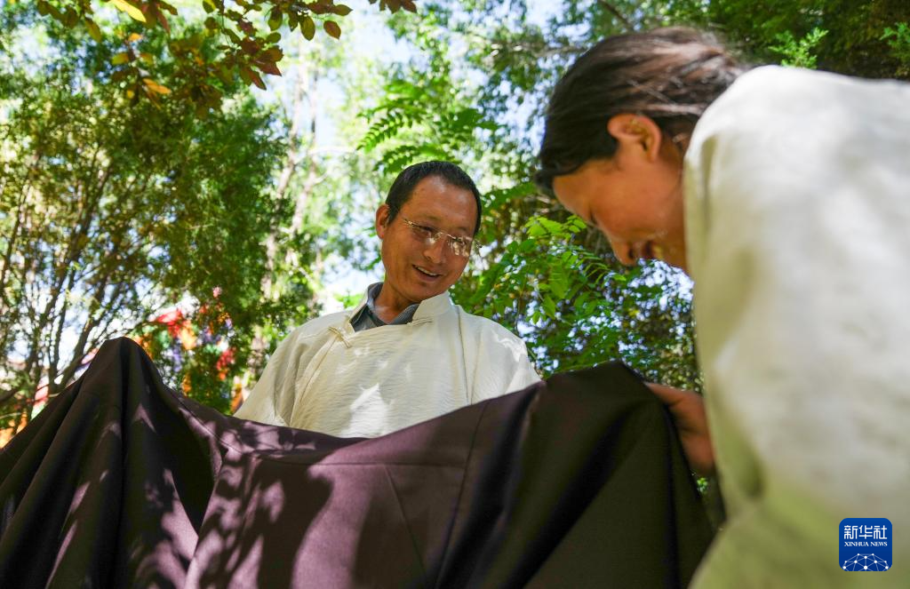 洛桑麥朗在檢查做好的藏裝(8月15日攝)。新華社記者 晉美多吉 攝