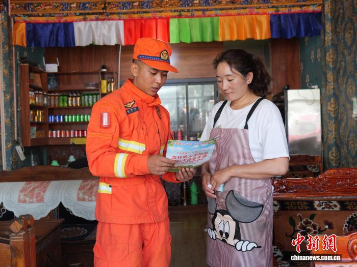 圖為消防隊(duì)員正在深入轄區(qū)沿街“入戶式”宣講防災(zāi)減災(zāi)知識(shí)。林芝市森林消防支隊(duì)供圖