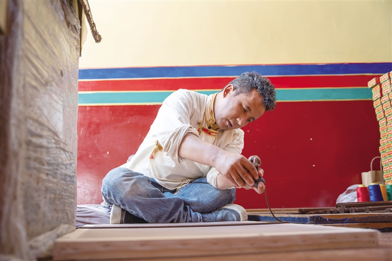 8月13日,記者來到尼木縣普松鄉(xiāng)曲水村的一個院落,58歲的斯曲正在窗邊埋頭雕刻,刻刀飛轉(zhuǎn)游走間,精致的花紋在木板上慢慢展現(xiàn),很快雕刻作品便初具雛形。作為普松雕刻第六代傳承人,斯曲自12歲起就在爺爺和爸爸的教導(dǎo)下開始學(xué)習(xí)這門手藝,如今的他早已成為普松雕刻自治區(qū)級非物質(zhì)文化遺產(chǎn)代表性傳承人。斯曲介紹,普松雕刻步驟煩瑣、工具講究,根據(jù)圖案復(fù)雜程度不同,耗時從6小時到3個月不等,十分考驗雕刻者的耐心。