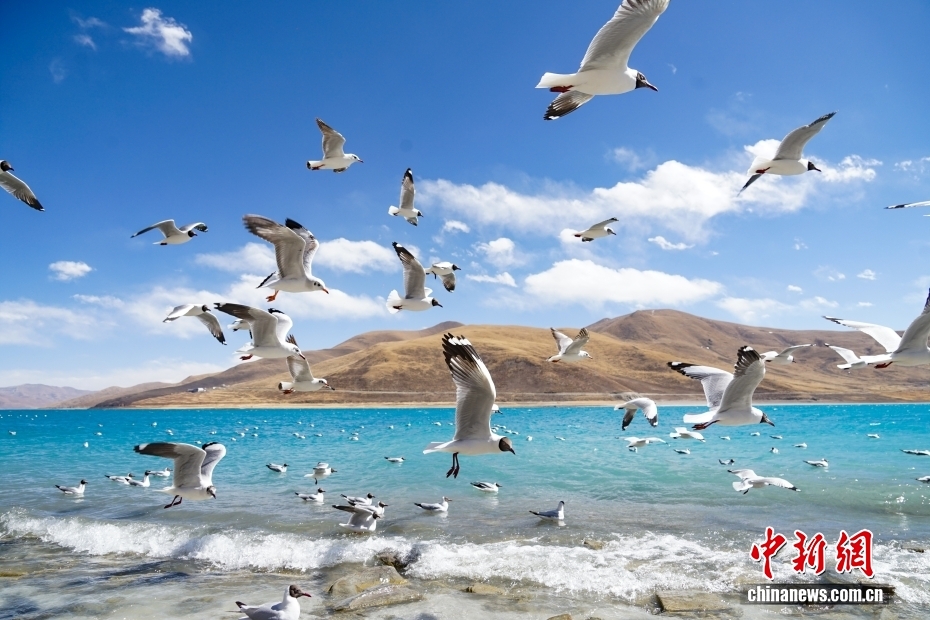 位于西藏自治區(qū)山南市境內(nèi)的羊卓雍措沿岸水鳥(niǎo)翔集。中新社記者 馬銘言 攝