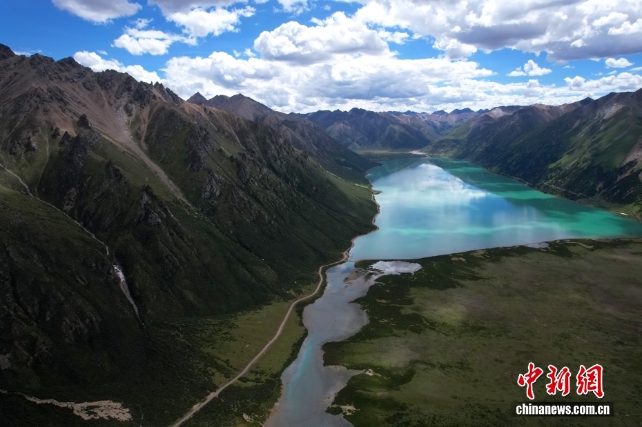 西藏那曲市,嘉乃玉錯(cuò)國(guó)家濕地公園碧波蕩漾,湖邊綠意盎然,在藍(lán)天白云映襯下,景色如畫(huà)。(無(wú)人機(jī)照片)中新社記者 李林 攝