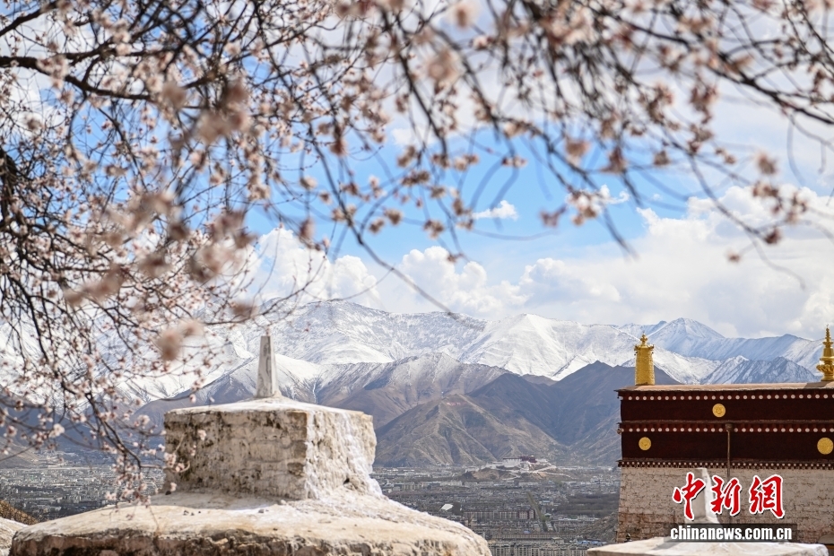 位于西藏拉薩北部山坳里的古剎帕邦喀周?chē)一ㄊ㈤_(kāi),吸引眾多游客前來(lái)觀光拍照。圖為帕邦喀周?chē)㈤_(kāi)的桃花和遠(yuǎn)處的布達(dá)拉宮。中新社記者 貢嘎來(lái)松 攝