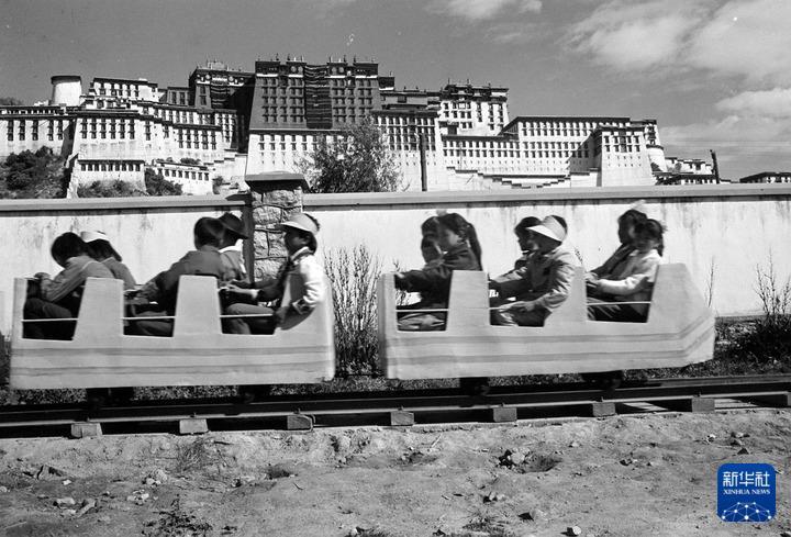 1987年10月1日,在拉薩勞動(dòng)人民文化宮內(nèi)新建成的大型游樂(lè)場(chǎng)里,小朋友們?cè)诔俗妱?dòng)小火車。
