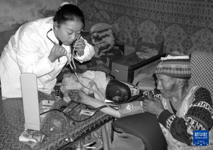2002年9月13日,青藏鐵路工地的醫(yī)生胡媛媛(左)在為藏族老人扎松檢查身體。自青藏鐵路開(kāi)工建設(shè)以來(lái),鐵路職工積極為沿線藏族同胞解決吃水、看病等問(wèn)題,為藏族同胞送溫暖。