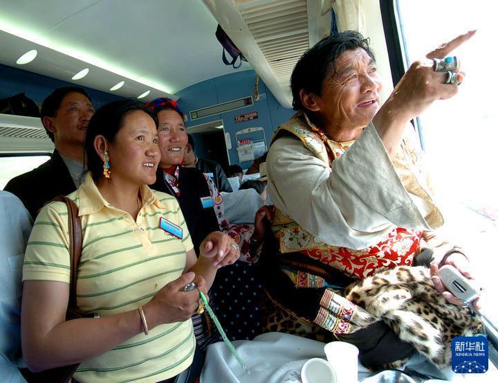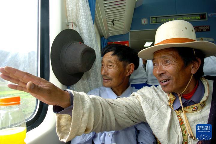 2006年7月1日,烏金(右一)乘坐的“藏2”次列車經(jīng)過(guò)自己家鄉(xiāng)安多時(shí),興奮地指向車外,向同伴介紹。