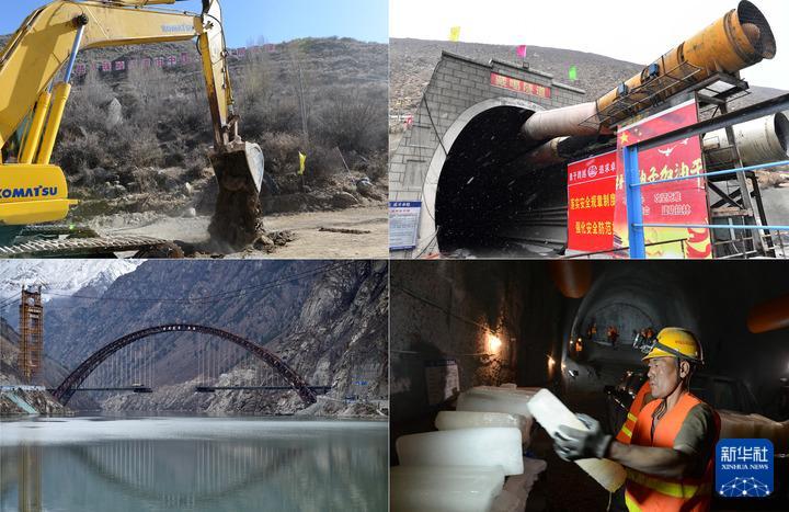 拼版資料左上圖:拉林鐵路西藏桑日縣桑珠嶺隧道開(kāi)工(2014年12月19日攝);左下圖:施工中的藏木特大橋(2020年4月5日攝);右上圖:拉林鐵路藏嘎隧道施工中(2020年4月5日攝);右下圖:工人把大量冰塊搬進(jìn)桑珠嶺隧道,用來(lái)降溫(2017年4月11日攝)。