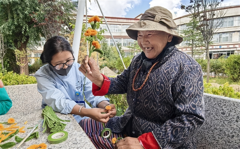 近日,記者走進(jìn)拉薩市社會(huì)福利院的大門,一陣歡快的笑聲便撲面而來。循聲望去,涼亭下,幾位老人正圍坐在一起,手中拿著彩色毛線,在編織老師的耐心指導(dǎo)下專注地編織著花朵?!翱矗业幕ㄗ龊昧?!”卓嘎老人高高舉起剛剛完成的一朵黃色小花,孩子般興奮地向同伴們展示。她的手指雖有些顫抖,但眼神中卻掩飾不住自豪。另外一邊,幾位老人正在院子里悠閑地散步,一位護(hù)工正小心翼翼地?cái)v扶著行動(dòng)不便的老人,輕聲問道:“今天腿還疼嗎?要不要去理療室做做按摩?”關(guān)切之情溢于言表。